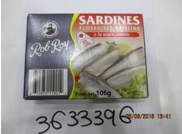 • Sardine ”Rob Roy” in sos tomat, 160 grame, stoc disponibil 22.000 de bucati, pret 0.46 euro/buc. Expira la data de 30/04/2018.