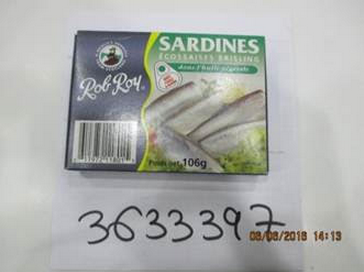 • Sardine ” Rob Roy” in ulei vegetal, 160 grame, stoc disponibil 10.000 de bucati, pret 0.46 euro/buc. Expira la data de 30/04/2018.